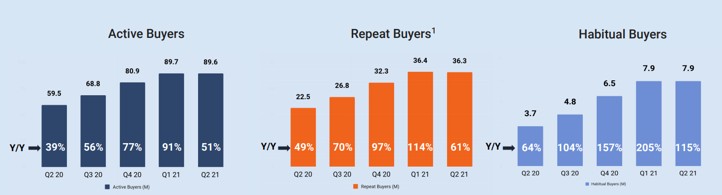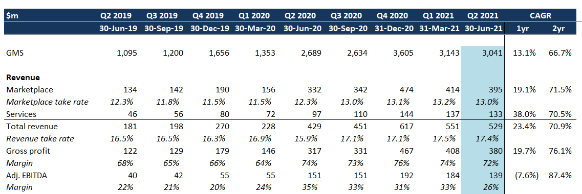 GMS ($3.04bn), revenue ($529m) and Adj. EBITDA ($139m) were all within guidance but below the top-end of the range (typically the company has beaten the top end of the range). GMS and revenue grew 13% and 23% yoy respectively on what was a huge quarter last year given it was peak-pandemic (GMS grew 146% in Q2’20). Excluding masks (which were 13% of GMS in Q2’20) GMS growth was much higher at 30%. Looking at 2-yr historic growth (‘19-’21), GMS and revenue CAGR of 67% and 71% is still exceptional