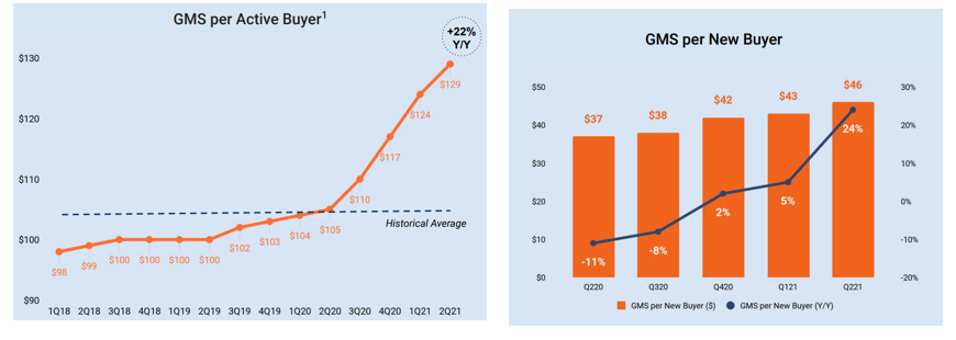 Q3’21 GMS guidance was $2.9-3bn which represents 12% growth at the mid-point, however this does include the contribution from Depop and Elo7 which were not there last year. The guidance for Etsy standalone was mid-single digit growth. While this does appear low, as a reminder Q3’20 was a sensational quarter where GMS grew 120%. Excluding the impact of masks from the Q3’20 number, Etsy standalone growth is expected to be mid-teens, which seems more reasonable. Revenue guidance of $500-525m represents 13.5% growth at the mid-point, and implies a take rate of 17.4% (in line with this quarter’s take rate). On a 2-yr basis the CAGR for GMS and revenue respectively is 57% and 67%, a very strong growth rate.