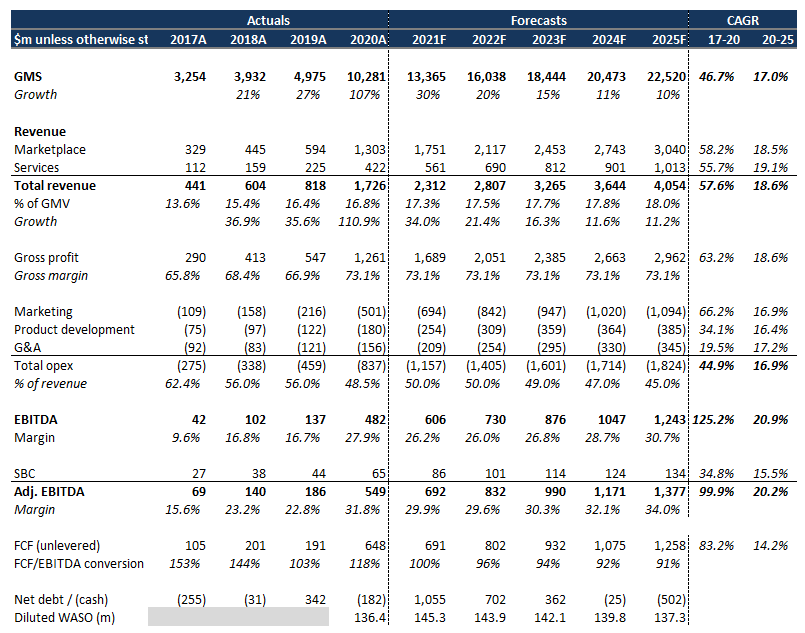 Considering the Q2 actuals and soft Q3/Q4 guidance, my FY21 estimates admittedly appear a bit on the high side now, however in the years beyond that I incorporated a significant slowdown (GMS / revenue CAGR of 17% / 18% FY20-25 respectively) which makes me relatively comfortable. On the earnings side, I baked in a reduction in overall profitability for FY21 to account for the impacts of the aforementioned higher opex investment in marketing, product and the acquisitions. I also don’t expect margins to recover to their FY20 levels until FY24 which I believe is fairly conservative. Overall my original longer term revenue and earnings forecasts are still below the updated analyst consensus which have now been revised downwards. The key thing is that I am not too focused on the accuracy of the year to year numbers (which are always going to be off) as I am on the ballpark trajectory of the business over the long term.